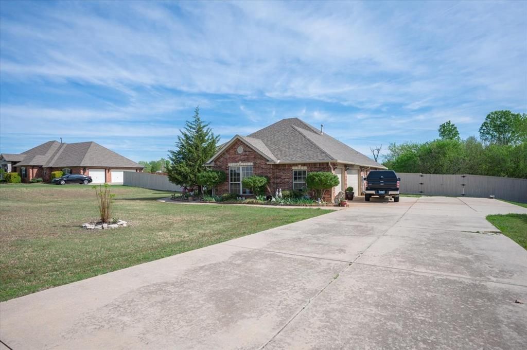 Located in the highly desirable gated community of Twin Lakes off South Sooner Road, this beautifully maintained home offers the perfect blend of space, privacy, and comfort on approximately 1.23 acres. With 2,311 square feet, this property features four bedrooms, two and a half bathrooms, and a thoughtfully designed layout ideal for both everyday living and entertaining.Inside, the home showcases exceptionally high ceilings and expansive, tall windows that flood the space with natural light. From both the living room and the formal dining area, these windows provide stunning views of the large, peaceful backyard, creating a seamless connection between indoor and outdoor living. The living room is anchored by a charming fireplace, adding warmth and character to the open space.The home includes a formal dining room adorned with an elegant chandelier, as well as a separate breakfast or casual dining area, offering flexibility for gatherings and daily use. The kitchen is centrally positioned to serve both spaces efficiently.Step outside to enjoy the spacious backyard, complete with a second back patio-perfect for relaxing, entertaining, or enjoying the quiet surroundings. With no direct neighbors behind the property and a natural tree line in place, the backyard offers added privacy and scenic views.Additional exterior features include a long driveway leading to a three-car garage, providing ample parking and convenience. The property also includes an above-ground storm shelter, an essential and valuable feature for Oklahoma homeowners.This home stands out for its combination of acreage, gated community living, functional layout, and peaceful setting-making it an excellent option for buyers seeking space, privacy, and quality in Moore, Oklahoma.