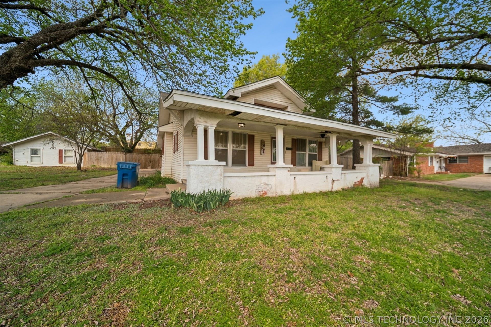Relax on your spacious covered front porch overlook your beautiful treed lot. This HOME is loaded with character and plenty of space with 3 bedrooms. Refinished wood floors in the spacious living dining combo. Remodeled kitchen (2021) New cabinets, built in microwave, stove, dishwasher, walk in pantry complete with sliding barn door. Full electric rewire 2021, Newer paint, Heat & Air 2022, hot water heater 2023. New Plumbing in 2024. Bath remodel 2021. New flooring in both front bedrooms. New insulation around windows, doors & attic in 2023, Backyard is ready for your animals with a privacy fence (2023) The property has a separate guest house presently used as storage but ready for your handyman. OWNER/SELLER is a licensed agent/Broker in OK