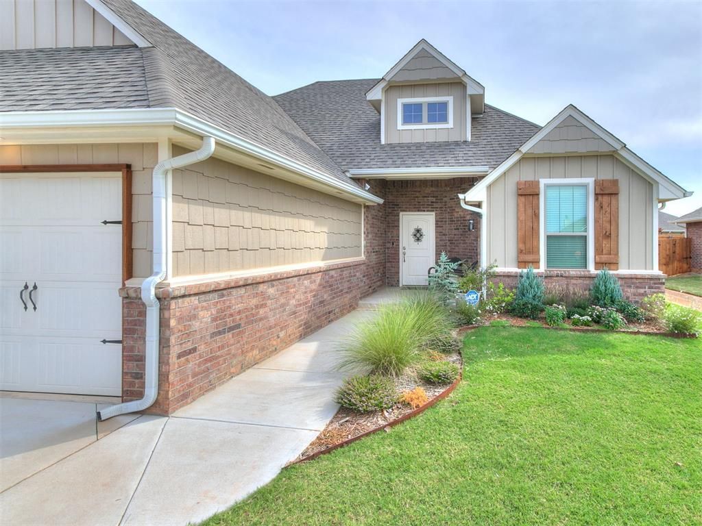 Beautifully designed 4-bedroom, 3-bath home offering an open, functional layout with stylish finishes throughout. The kitchen is a standout, featuring quartz countertops, tile backsplash, a large island with storage and outlets, slow-close cabinetry, coffee bar, 4-burner gas cooktop, built-in oven and microwave, USB-C outlets, and a spacious walk-in pantry. The living area is warm and inviting with vaulted ceilings, a fireplace accented by a wood beam and mantel, and a dining space ideal for gatherings.The primary suite is a true retreat with vaulted ceilings, double vanities, a whirlpool tub, a walk-in shower, two closets, and a three-season closet. Upstairs, you'll find a generously sized bonus room complete with a full bathroom-perfect for a game room, guest suite, home office, or flex space-along with convenient attic access.Enjoy outdoor living on the covered back porch with a built-in fireplace overlooking a large backyard, ideal for relaxing or entertaining. Additional highlights include a three-car garage with an in-ground storm shelter and storage, a tankless water heater, sprinkler system, blinds throughout, and a spacious laundry room with a hanging bar. This move-in-ready home blends comfort, functionality, and thoughtful design throughout.